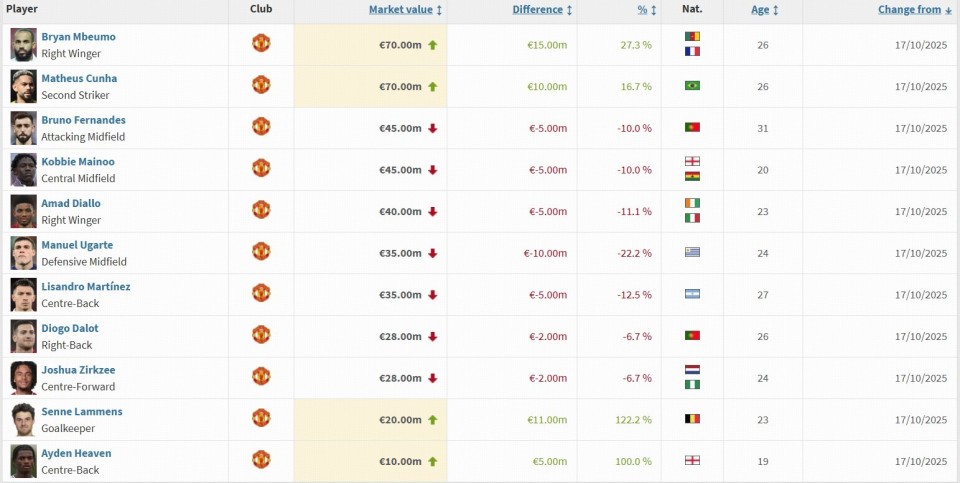 曼联球员身价变动:姆伯莫上涨1500万欧,乌加特下跌1000万欧